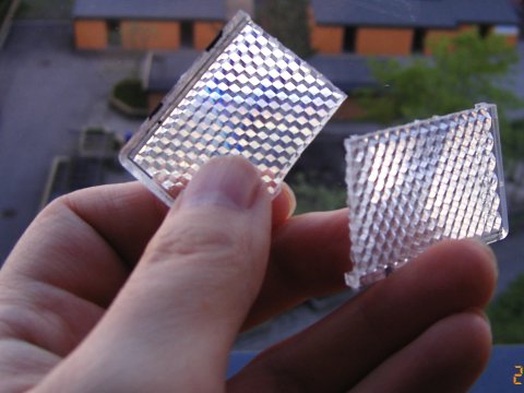 One side of each panel is covered with diagonal cubes, which do the retroreflection by internal reflection.